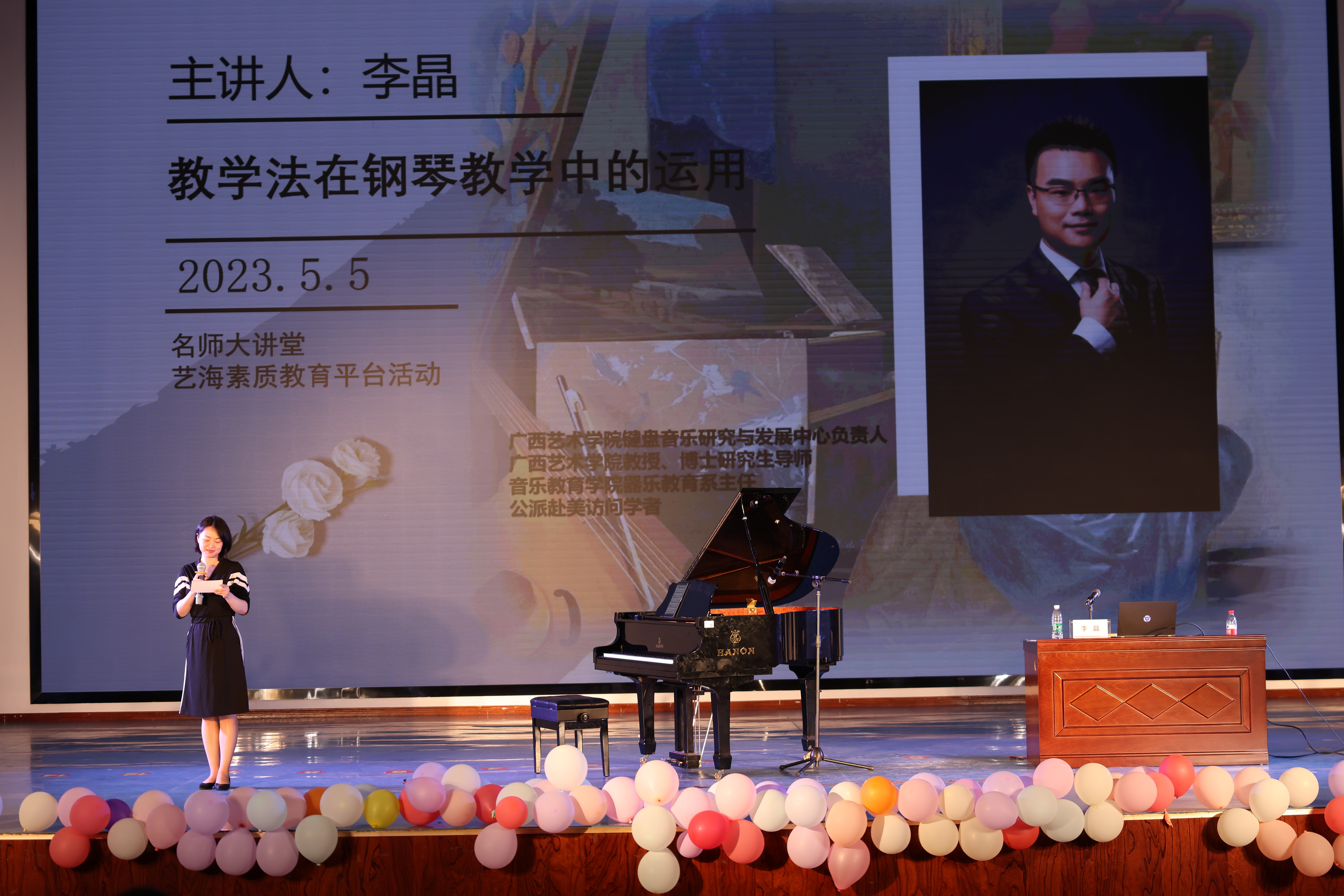 5月5日晚,李晶教授做客名师大讲堂,为我校师生带来了一场精彩的“教学法在钢琴教学中的运用”讲座。北海艺术设计学院副校长王斌,人文教育学院副院长李谦,学院各部门相关负责教师以及艺术教育专业、学前教育与播音主持专业学生参加讲座。讲座由艺术教育教研室孙嘉昕主任主持。