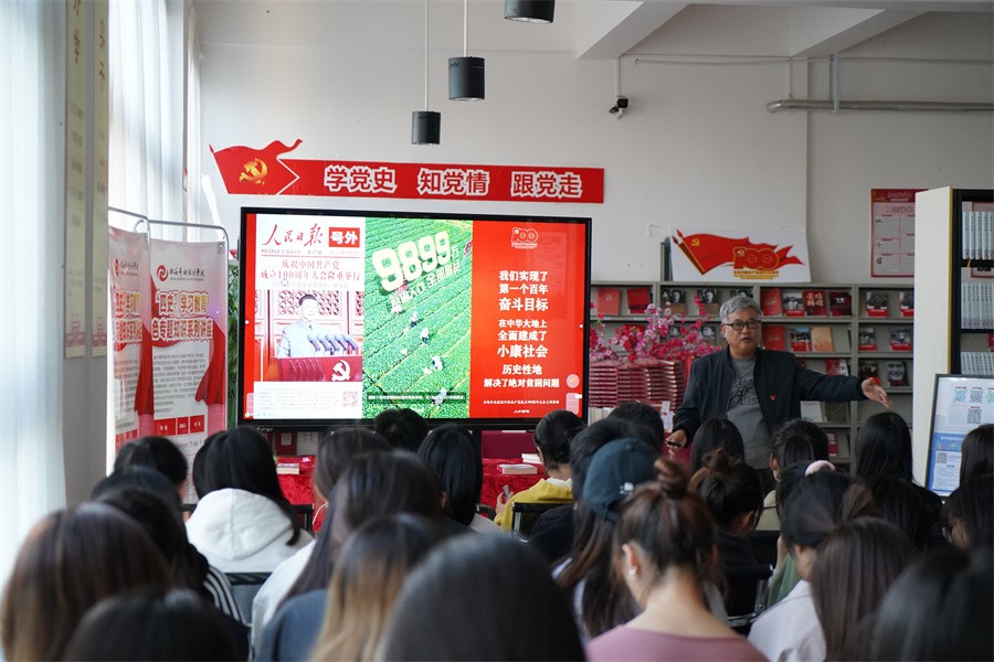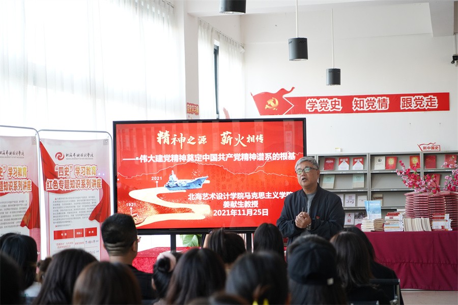 为持续推进“四史”教育进校园、进课堂,营造知史爱党、知史爱国、爱社会主义的浓厚红色氛围,11月25日下午,马克思主义学院院长姜献生教授在图书馆三楼“红色阅读角”开展“四史”红色知识教育系列讲座之《精神之源 薪火相传——伟大建党精神奠定中国共产党精神谱系的根基》,马克思主义学院和人文教育学院部分师生共60人参加讲座。