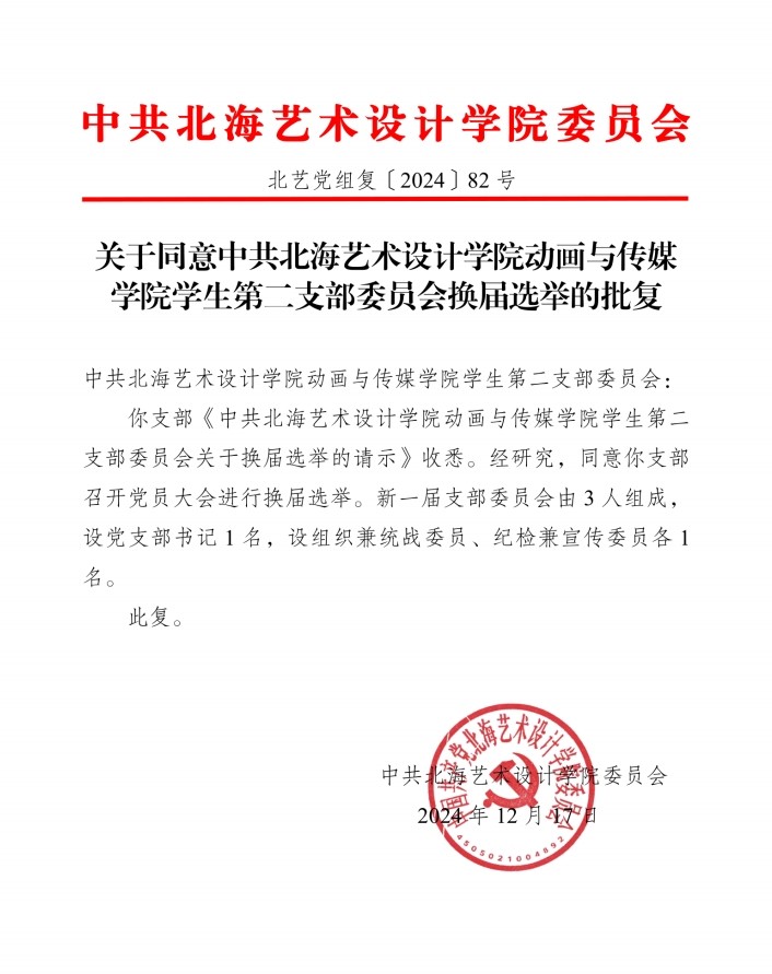 关于同意中共北海艺术设计学院动画与传媒学院学生第二支部委员会换届选举的批复