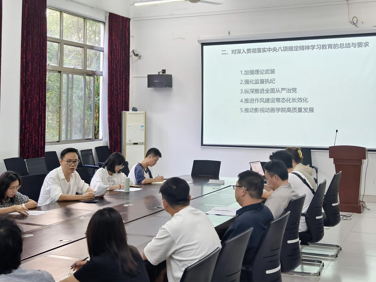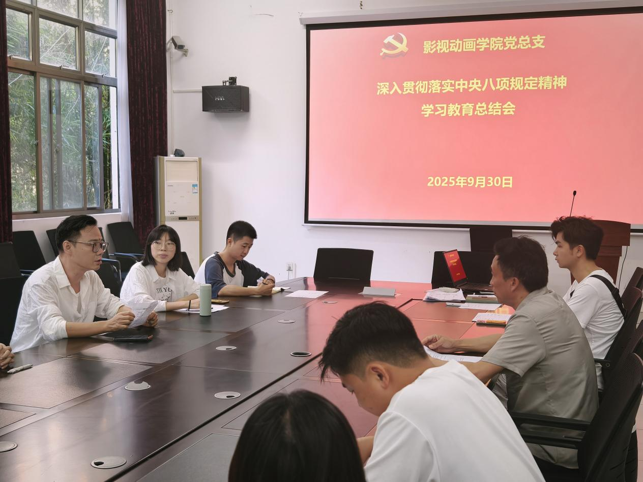 9月30日,影视动画学院党总支召开深入贯彻落实中央八项规定精神学习教育总结会,传达学习习近平总书记重要指示精神,总结学院学习教育开展情况,部署推进作风建设常态化长效化工作。学院党总支书记张帆主持会议并讲话。