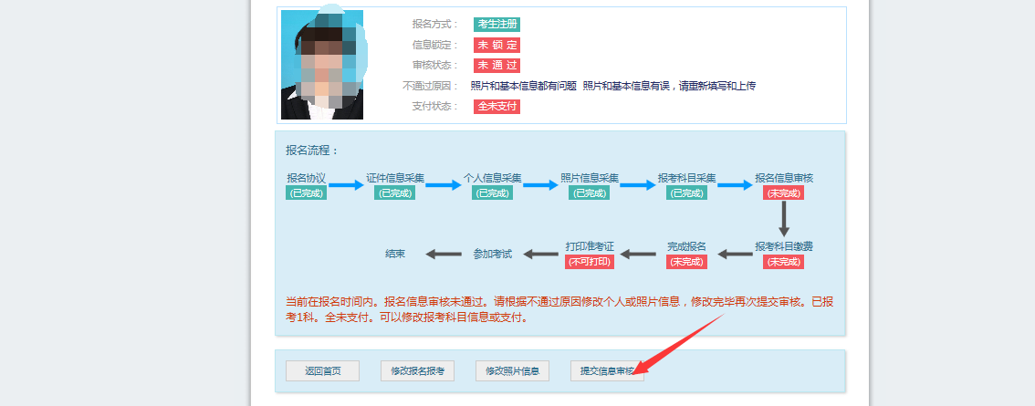 若考点设置审核信息不通过,则考生可根据考点填写的不通过原因进行修改,重新提交审核。