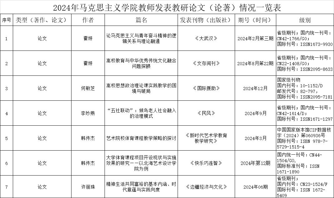 2024年马克思主义学院教师发表教研论文(论著)情况一览表(汇总)