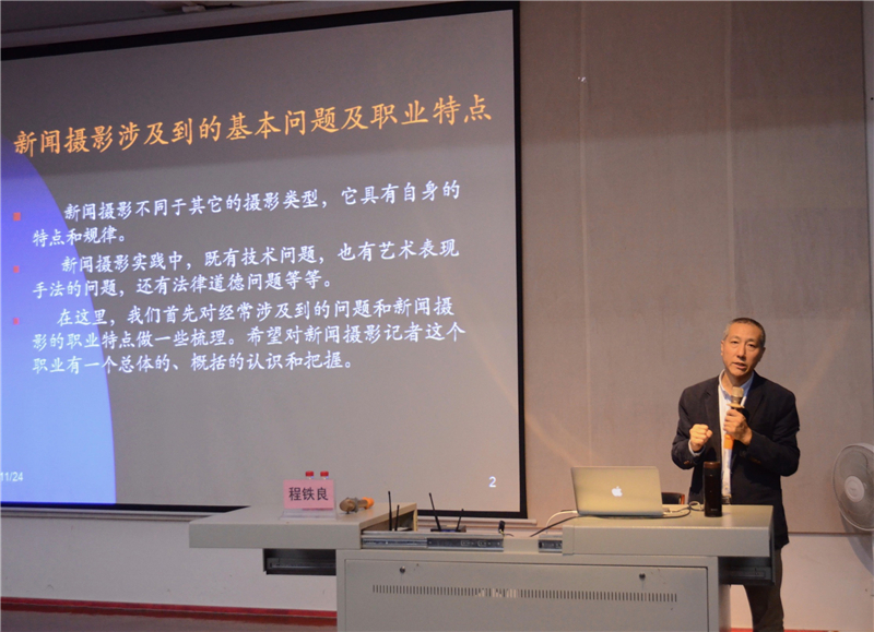 接下来程铁良教授用一些案例讲解了新闻摄影中的基本问题及职业特点。新闻摄影不同于其他摄影类型,它具有自身的特点和规律,在新闻摄影中有技术、艺术表现手法和法律道德问题,通过分析个别图片让同学们学习到更多摄影方面的知识,并了解到训练和经验是提高结构画面能力的结果,寻找独特且合适的拍摄角度是摄影记者的不懈追求。