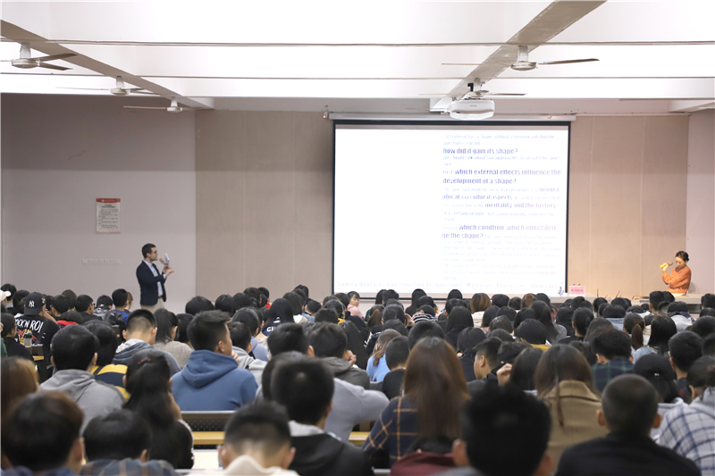 讲座开始,安德拉斯博士为我们介绍了他的个人经历及佩奇大学的概况。安德拉斯博士通过展示一些学生的优秀作品,谈到设计当中一些基本原理的元素对于建筑本身的展示有一定的影响,设计师在做设计的时候通常都会受很多因素影响,比如地质学、构造学与类型学。对于形状是如何形成这一问题,安德拉斯博士为同学们进行了详细的解答,同学们顿时豁然开朗。