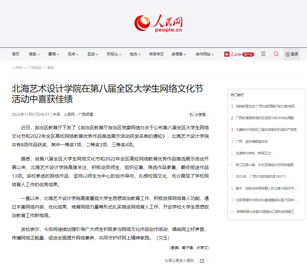 人民网:北海艺术设计学院在第八届全区大学生网络文化节活动中喜获佳绩