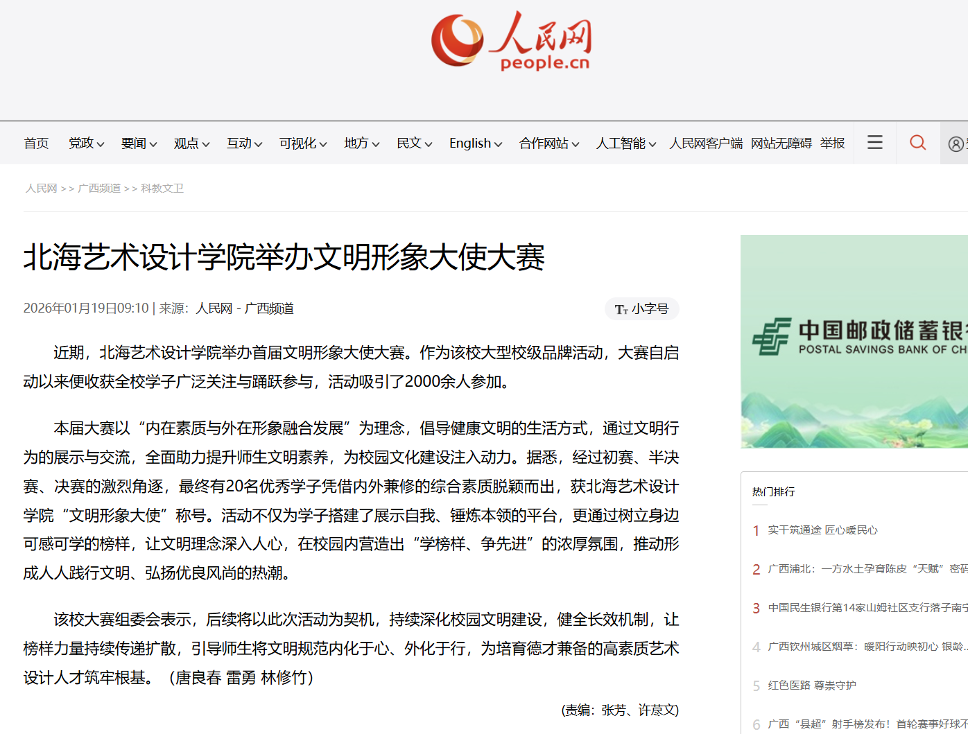 人民网:北海艺术设计学院举办文明形象大使大赛