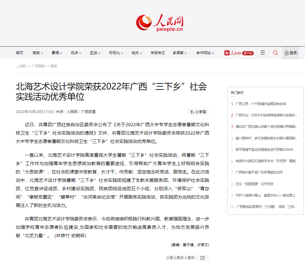 人民网:北海艺术设计学院荣获2022年广西“三下乡”社会实践活动优秀单位