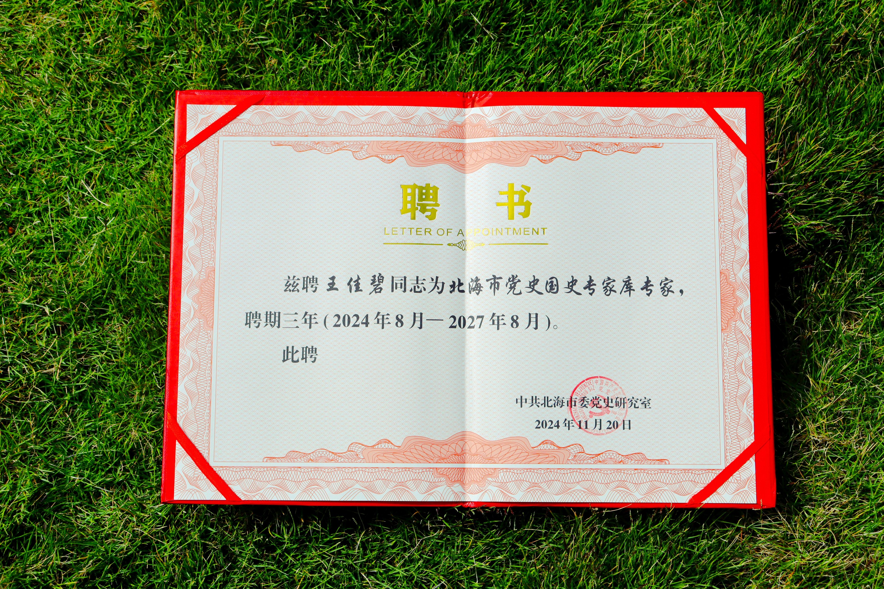 我院综合办主任王佳碧荣聘为北海市党史国史专家库专家聘书