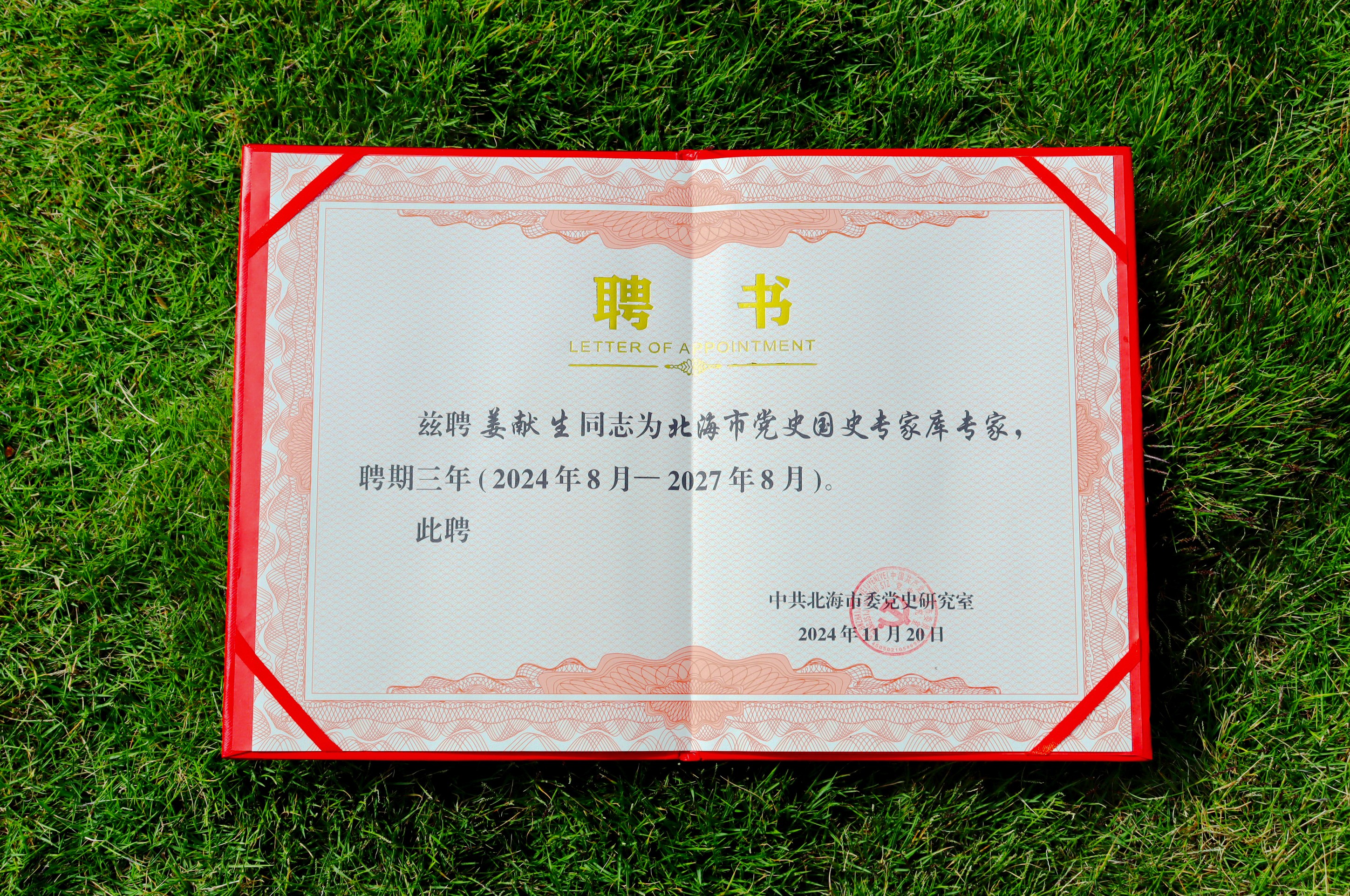 我院院长姜献生荣聘为北海市党史国史专家库专家聘书