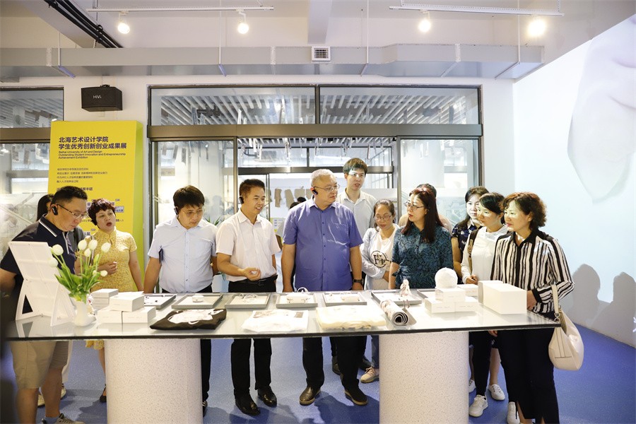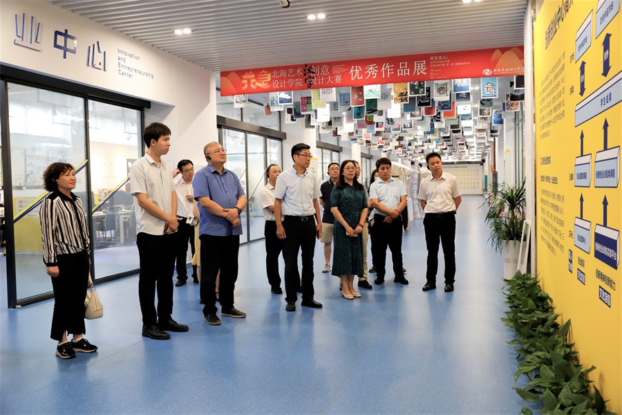 考察组一行先后参观了我校“本科教学综合改革成果展”“校政企行协同育人 服务地方经济发展”展厅以及大师工作室、学生作品展,观看了学校宣传片等,详细了解了学校发展历程、产学研融合、校政企合作、实践教育教学、服务地方经济发展等方面的建设经验和成果。双方还结合学校和北海发展实际,围绕师生作品创作服务地方旅游产业健康发展方面的具体经验做法进行深入交流。