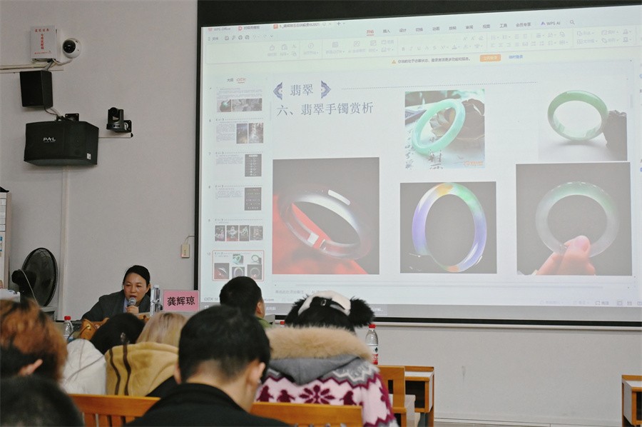 在专业知识讲解环节,龚辉琼大师系统梳理翡翠的颜色分类体系,详细解析不同质地的鉴别标准,从原石形态特征到成品艺术价值,通过图文对照的方式,让师生直观理解翡翠从“毛石”到“艺术品”的转化过程,既普及了玉石基础理论,又传递了实用鉴别技巧。