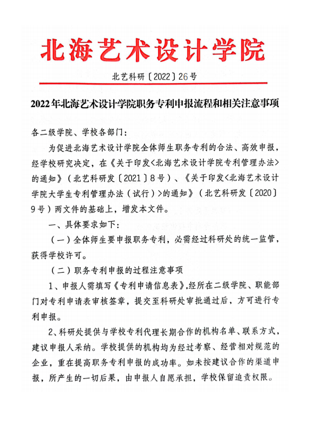 2022年北海艺术设计学院职务专利申报流程和相关事项