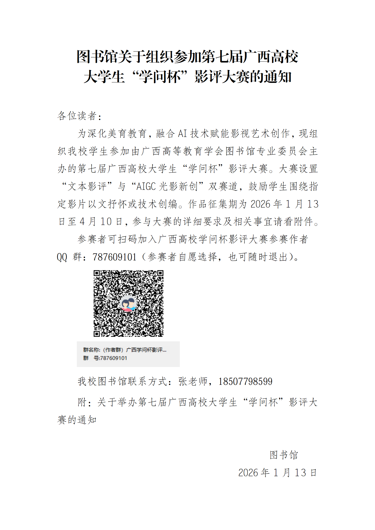 图书馆关于组织参加第七届广西高校大学生“学问杯”影评大赛的通知