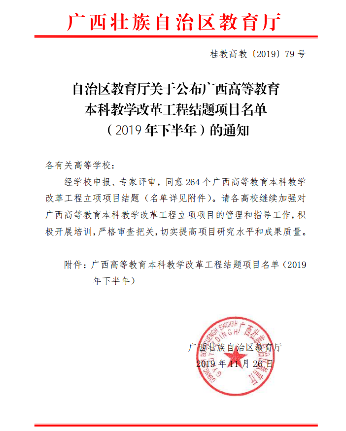 自治区教育厅关于公布2019年度 广西高等教育本科教学改革工程结题项目名单(2019年下半年)的通知