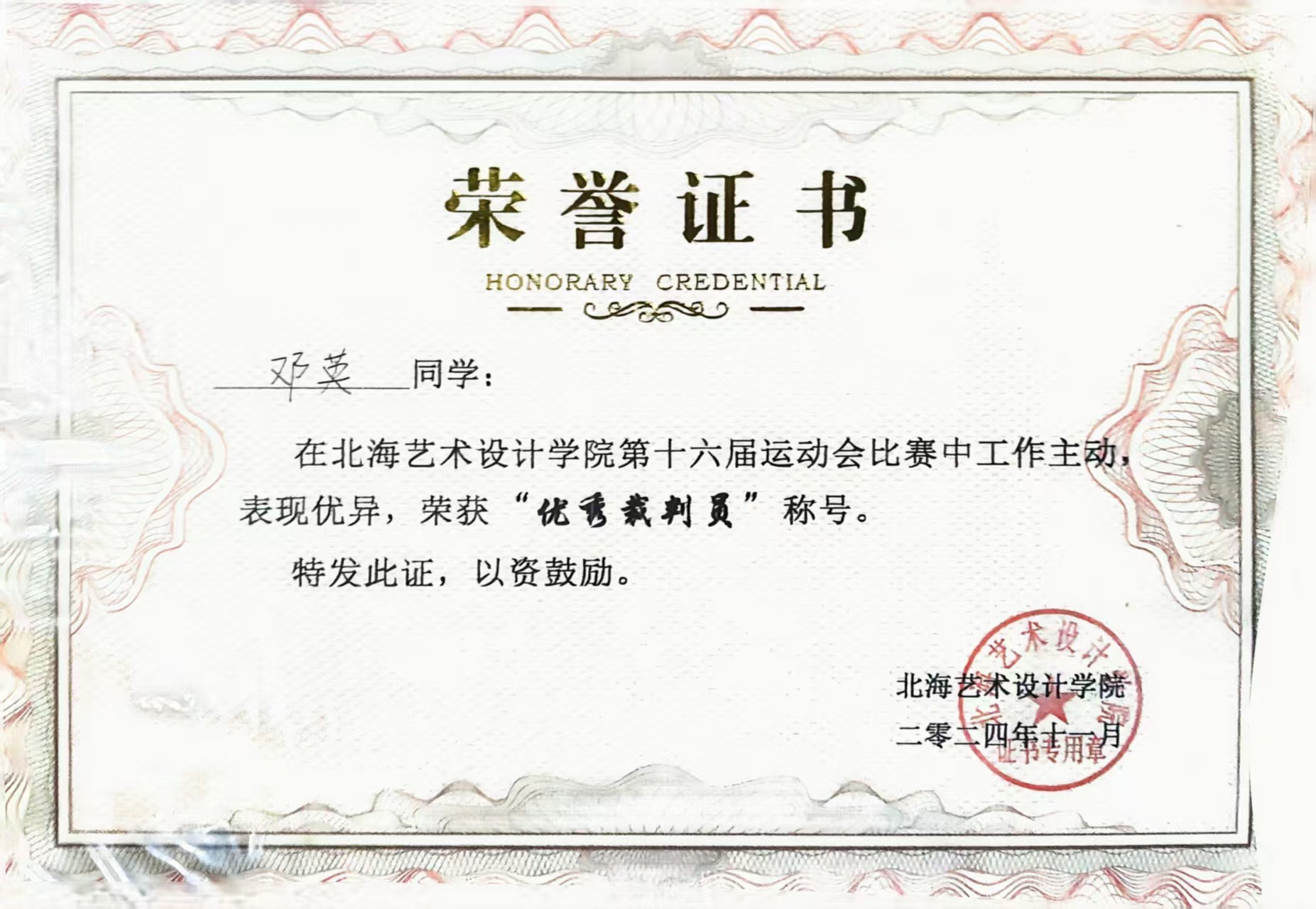 2024年 11月 在第十六届校运动会比赛中获“优秀裁判员”称号;