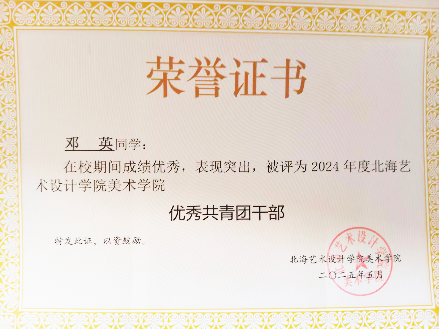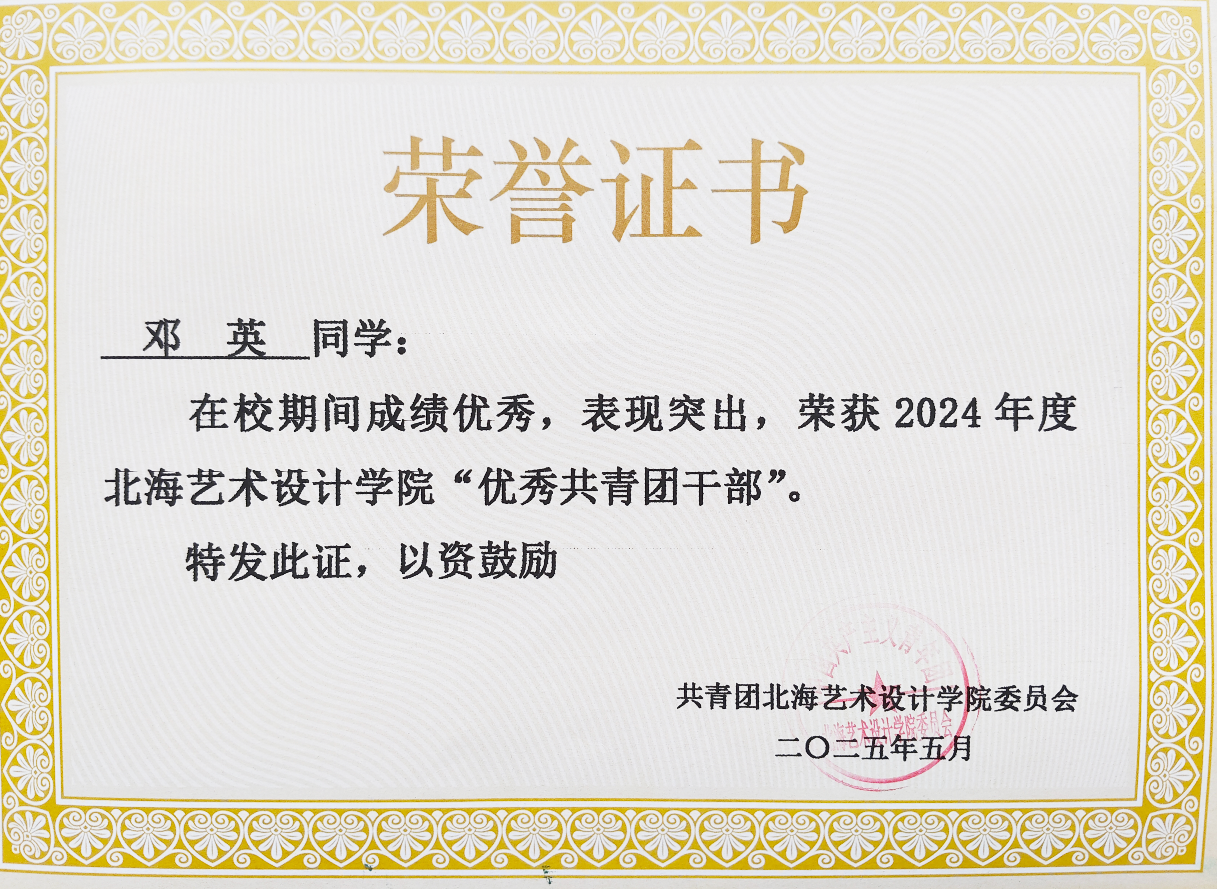2025年5月 2024年度北海艺术设计学院“优秀共青团干部称号