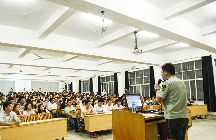 2016年4月20日晚上19:20分,我校邀请了北海市龙潭边防派出所的警官为我校师生开展了"校园安全知识讲座"。本次讲座首先通过李教导员"国家利益高于一切"展开话题,通过视频资料以及亲身经历,讲述了一个又一个无私奉献的故事,身为中国武警,应秉承国家、人民的利益高于一切的高尚品格,与忠诚意识融为一体,这是一种责任,是一种行动,李教导员为我们展示了当代军人迷人的风采,让在座同学们深深体会到那群“可爱的人”为了国家安全,人民安全所做的重要贡献,令同学们深感钦佩。