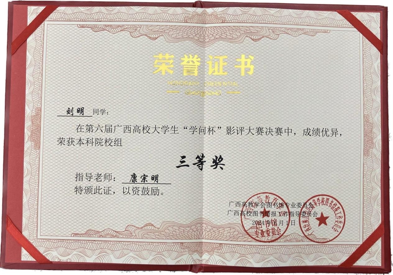 喜报|我校学生在广西高校图书馆“学问杯”影评大赛中斩获三等奖