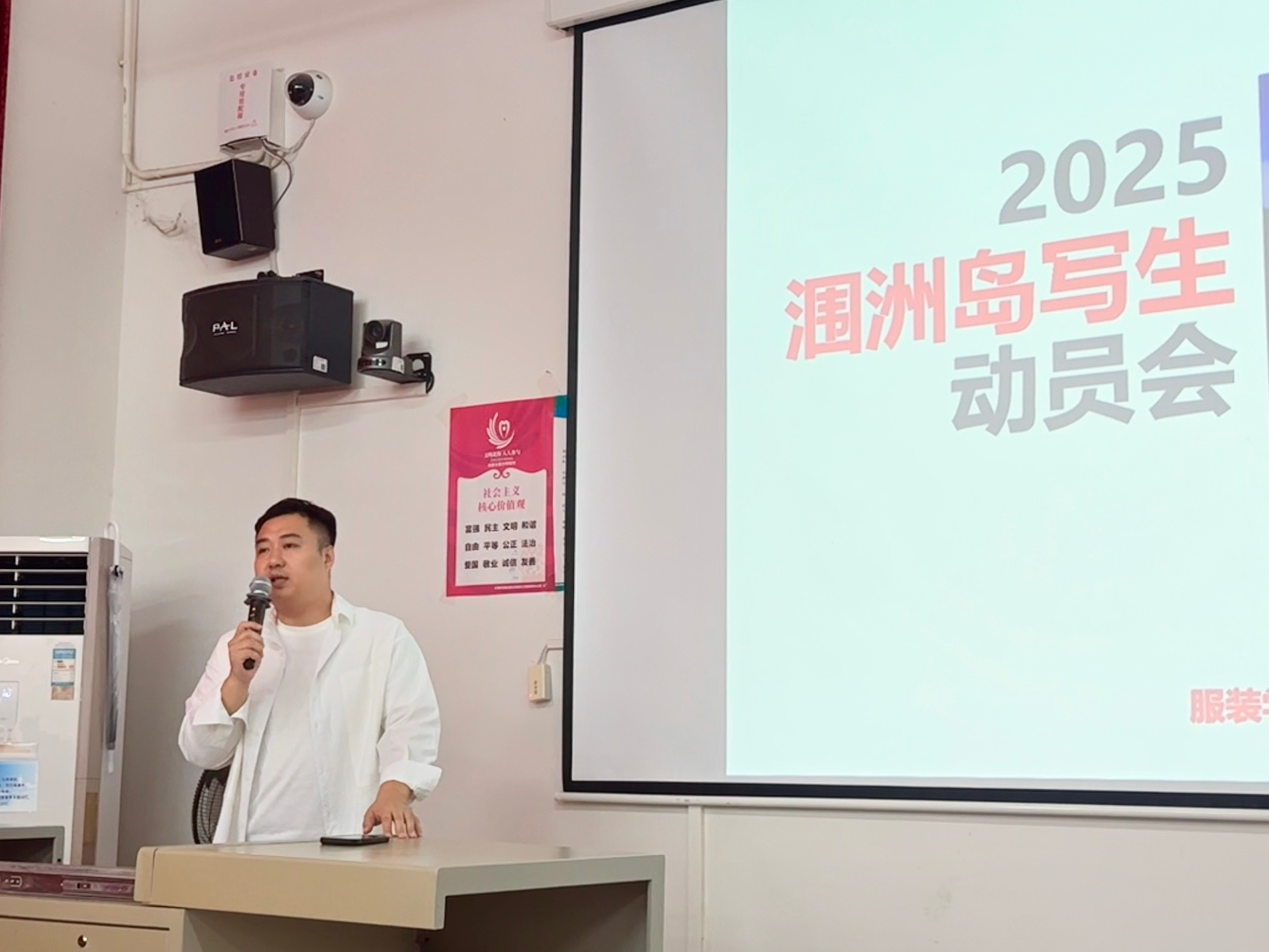 大会上,《写生》课程主讲教师江百汇详细讲解了读涠洲岛写生的各项教学任务指标、风景写生的技法要点与实施路径。结合专业人才培养需求,江百汇老师还为同学们开展摄影基础知识点培训,鼓励全体学生在写生实践期间同步创作摄影作品,积极参与我校第六届涠洲岛“鲸鱼杯”手机摄影大赛,以多元创作提升专业综合素养。