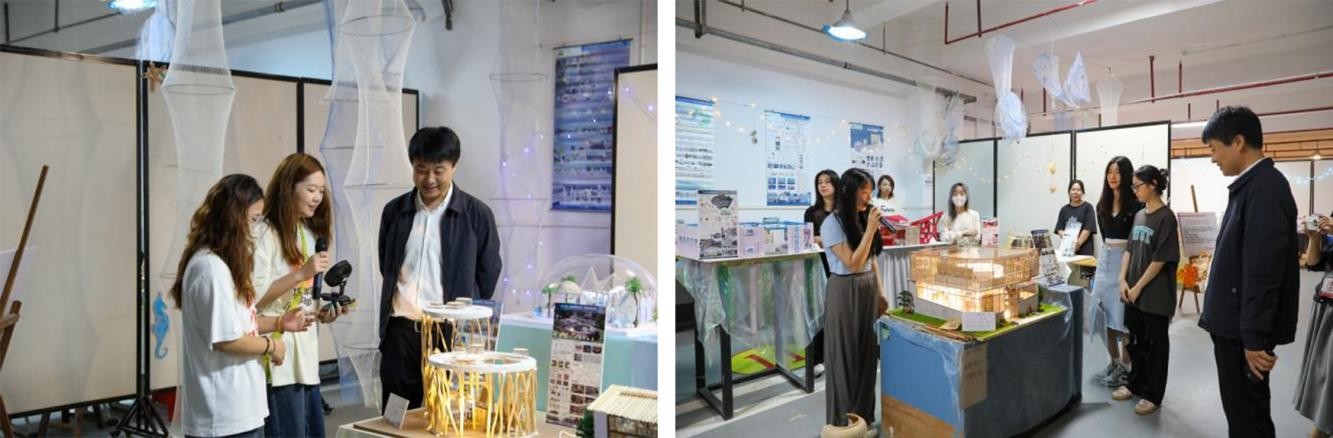 在设计展中,各班专业老师对本班情况进行介绍,并表示:在本次展览设计中锻炼了同学们多方面的能力——平面设计、立面构思、空间造型设计等,且同学们的作品极大程度上贴合了市场的需求,将所学内容落到实处。在每组同学阐述自己的设计理念后,老师从造型、灯光、色彩搭配等方面进行点评与总结,使得各展厅方案从整体达到更好的效果。
