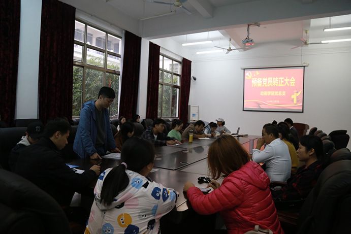 2018年12月7日下午17点,动画学院党总支在东校区综合楼一楼会议室成功召开了预备党员转正大会。会议由党总支副书记罗敏主持,讨论关于黄强红、张茹两名同志申请转为正式党员的问题,党总支书记陶立阳、14名教师党员与13名预备党员出席了会议。