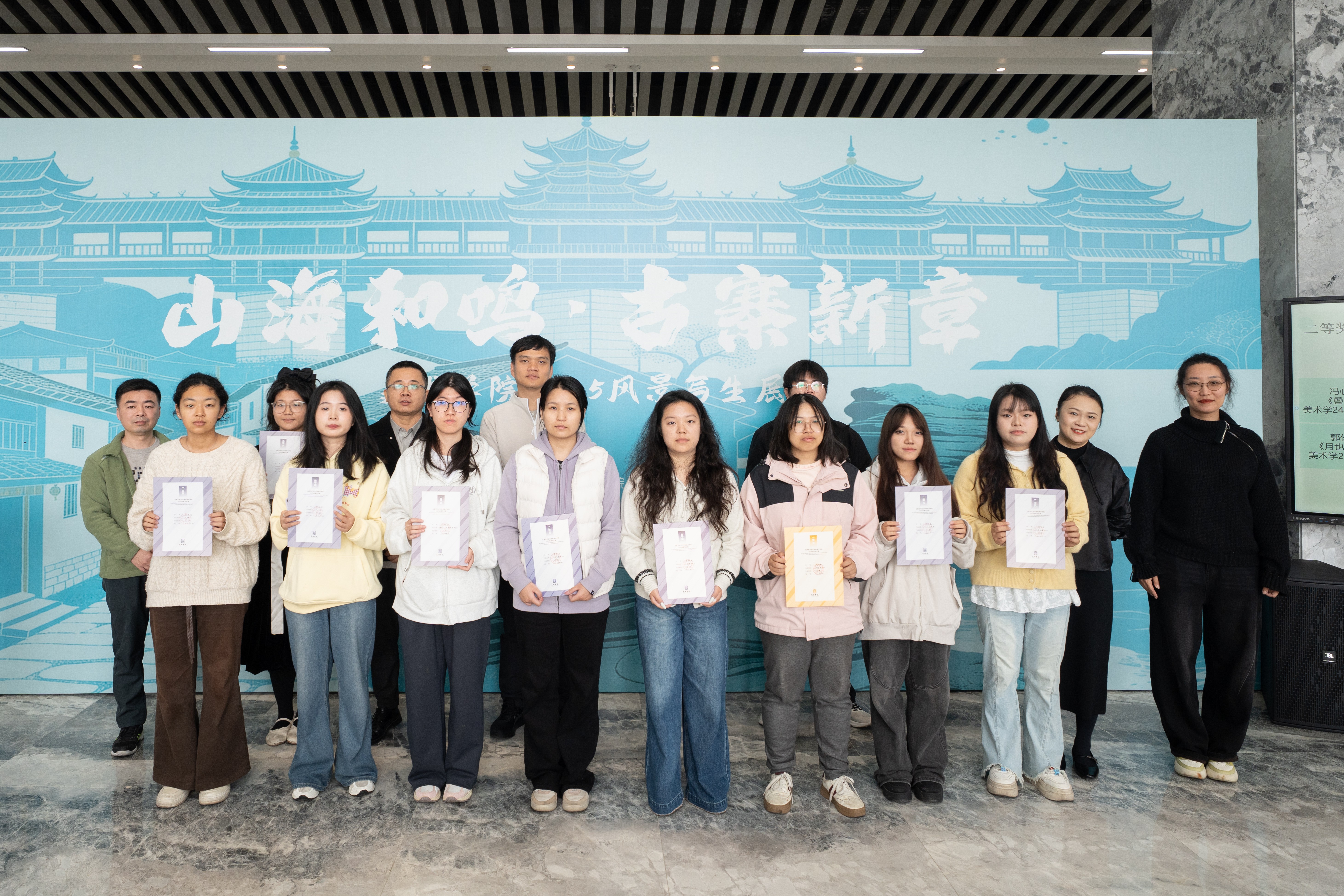 为鼓励学生积极参与社会实践和到自然中写生,激励他们创作出更多更好的艺术作品,本次展览设置了一二三等奖,在展览开幕前夕,学院成立了评委会并进行了严格的评审会议和评审流程,共遴选出一等奖10人、二等奖20人、三等奖30人。在颁奖环节,各位领导及嘉宾为获奖学生颁发了获奖证书。获奖学生们脸上洋溢着喜悦和自豪,他们的努力得到了认可和肯定。
