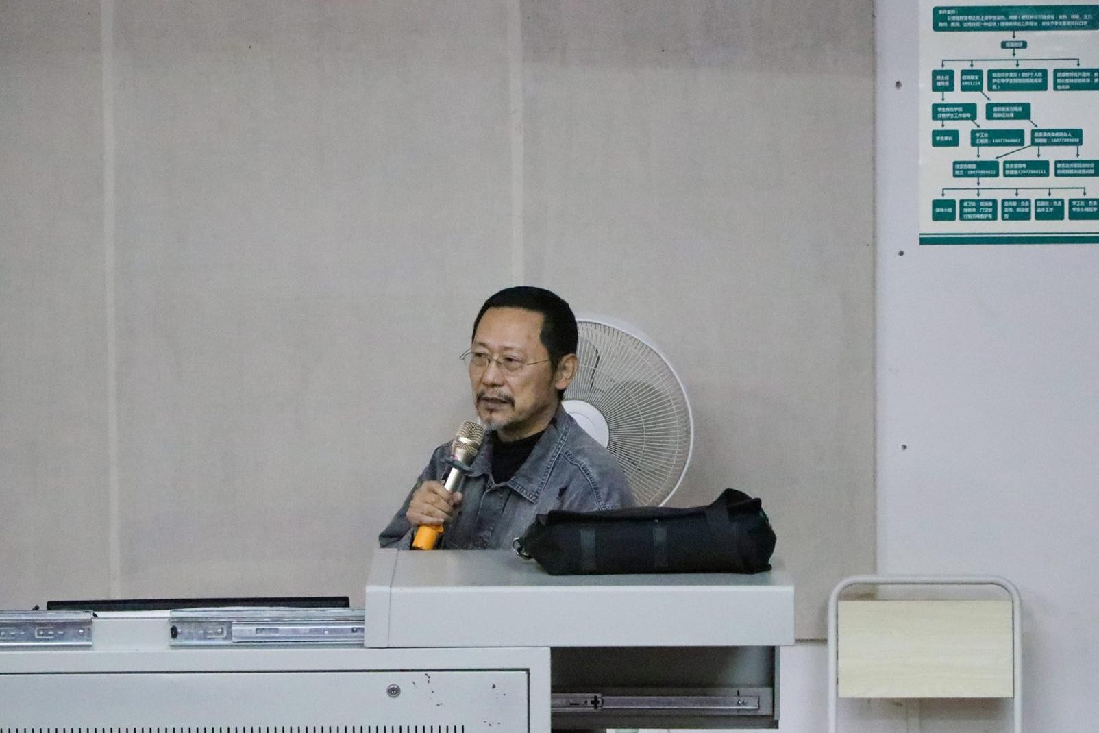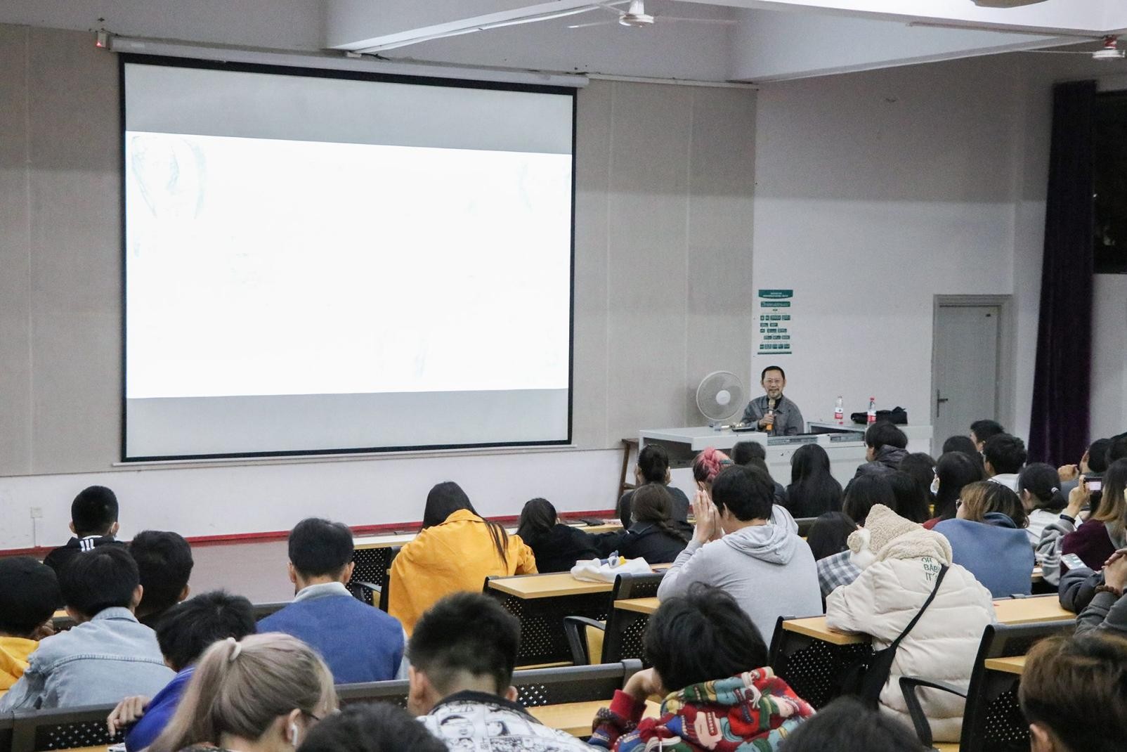 活动在晚上7:30分准时开始,刘教授讲述在上一次的讲座主为大一新生讲述有关基础教学上视觉训练的课程,而此次讲座主要讲述创作,为大二大三的学生解决在创作方面的问题以及为这些学生提出刘教授在此方面的见解以及方向。