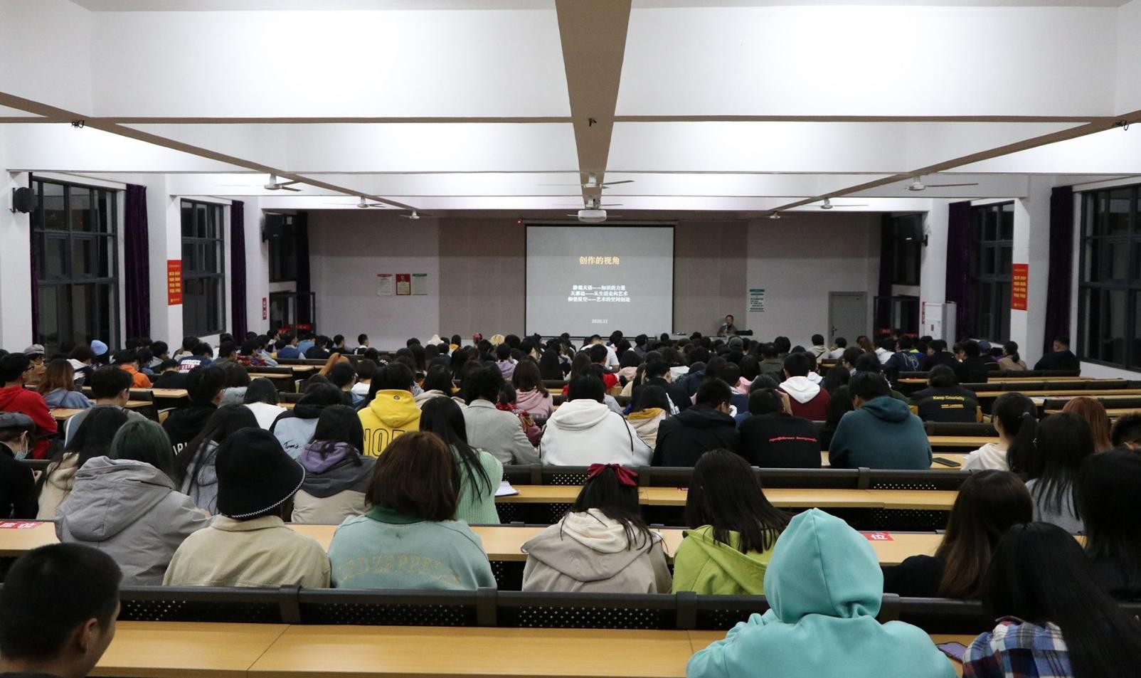 在2020年12月1日晚19:30时分,我校在北海艺术设计学院西校区大礼堂开展了一次名为《创作的视角——从静观天语到仰望星空》的演讲活动。