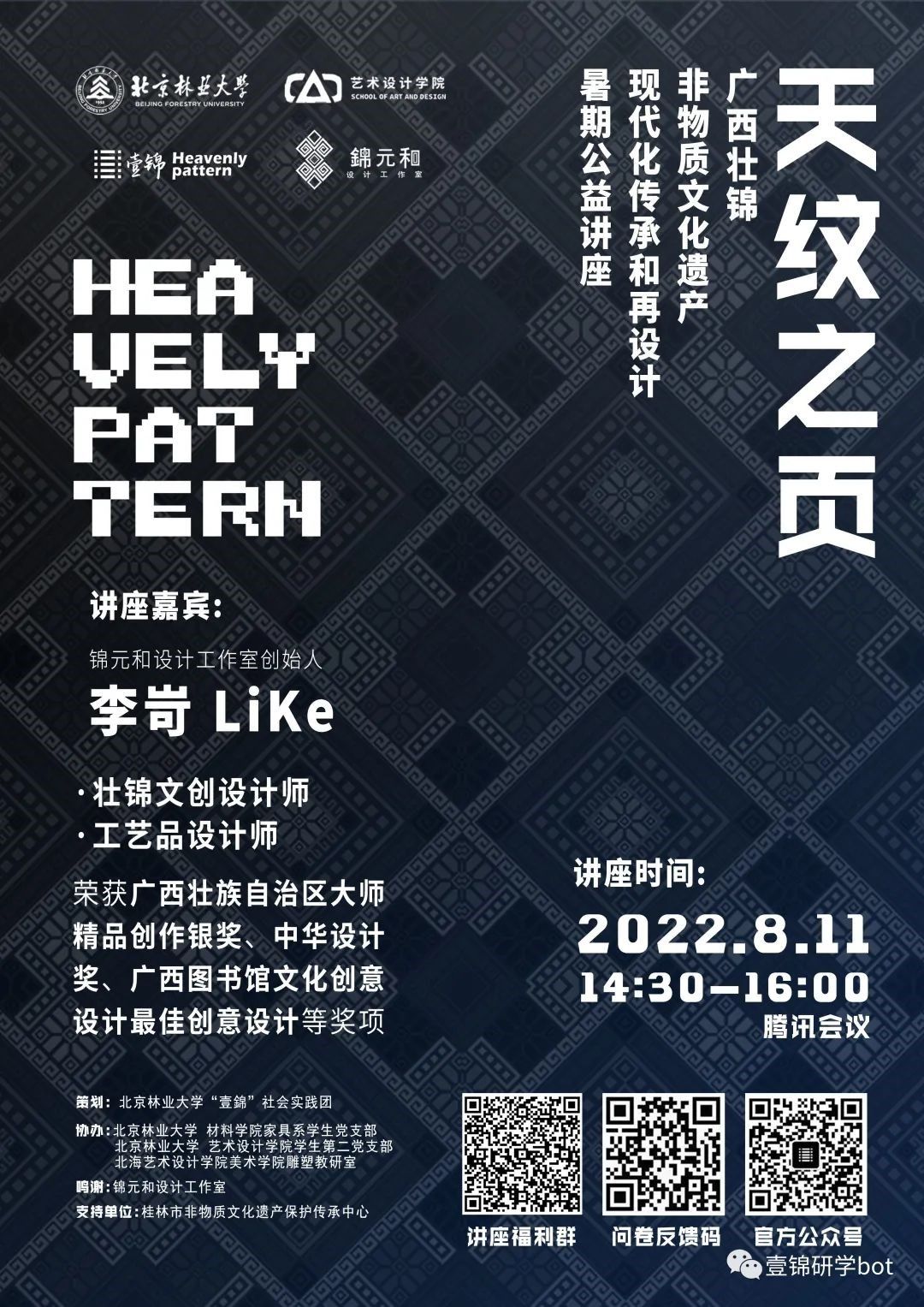 8月11日,美术学院雕塑专业与北京林业大学艺术设计学院本科第二学生党支部、材料学院家具学生党支部开展联建活动。活动由锦元和设计工作室创始人、壮锦文创设计师、工艺品设计师李岢老师作为主讲,展开题为《壮锦现代化传承和再设计》的讲座,本次活动以腾讯会议为平台,由桂林市非物质文化遗产保护和传承中心支持举办。