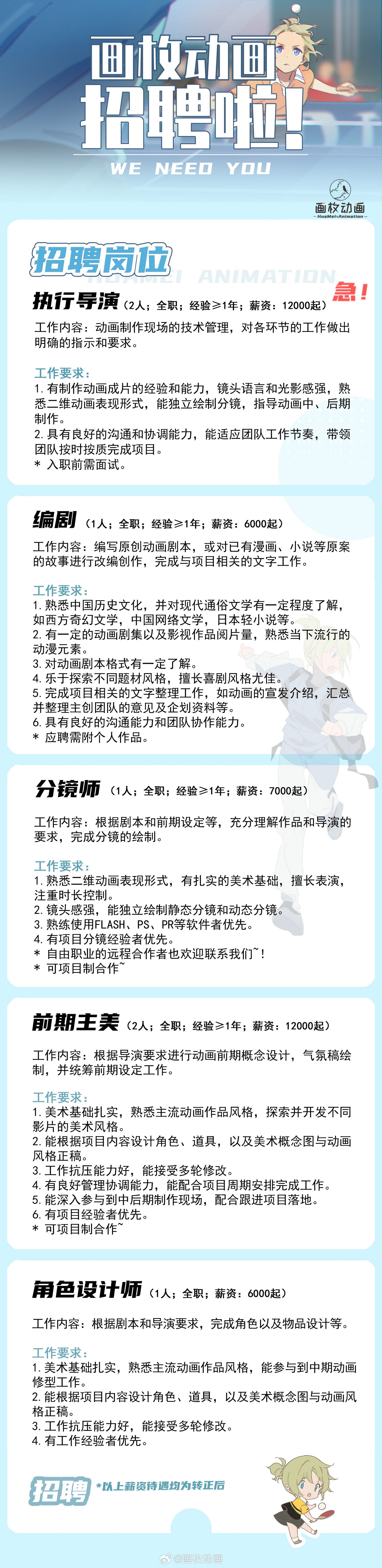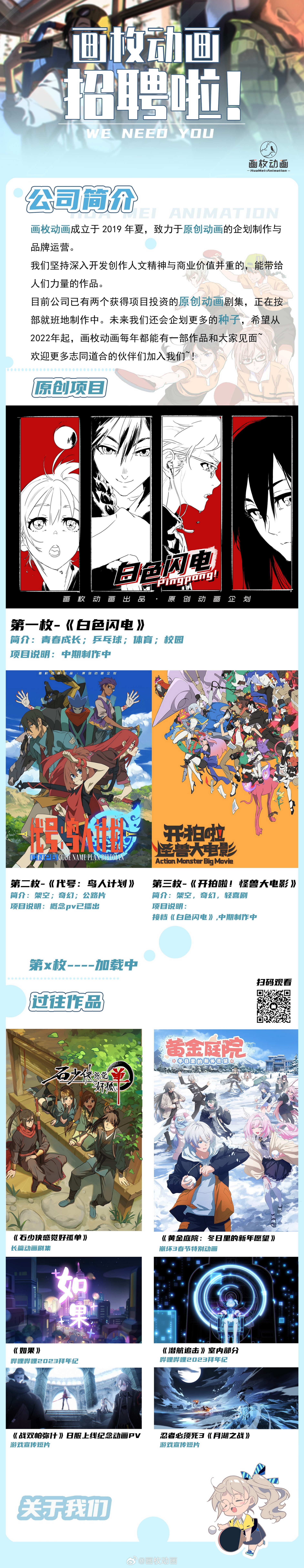 画枚动画招聘啦~(商务合作等请联系QQ:3561756733)最近两年都在长篇原创项目的制作中,期待你的加入,让我们一起来做动画吧!长年招聘~(只要微博没删就一直在招人。)