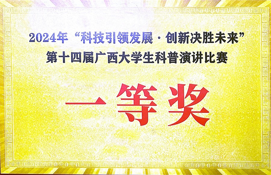 近日,第十四届广西大学生科普演讲比赛(决赛)在广西图书馆圆满落幕。我校师生在此次比赛中表现优异,学生林怡蓉荣获决赛一等奖,教师张丽君获大赛指导老师奖。