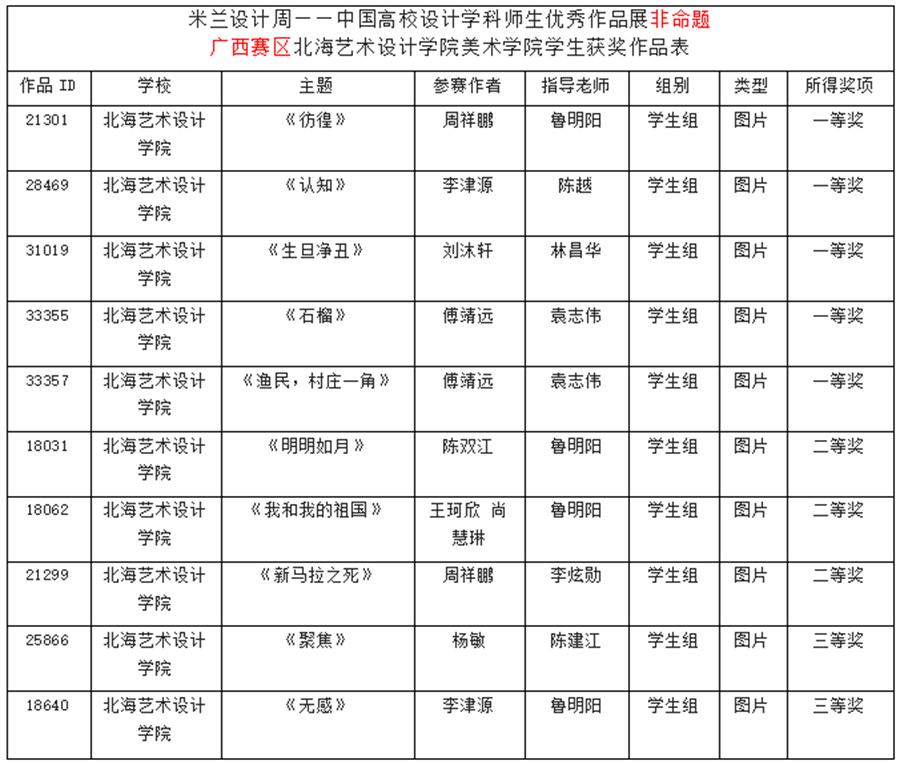 广西赛区北海艺术设计学院美术学院学生获奖作品表